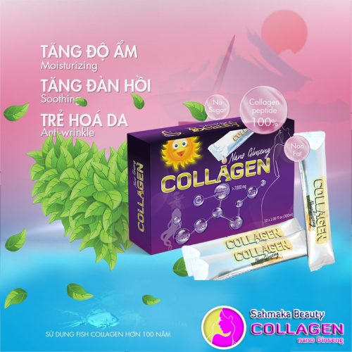 - Collagen Nano Ginseng sản xuất 100% collagen peptide – collagen thuỷ phân đã được tách ra thành các peptide nhỏ hơn và phối hợp thêm với nhân sâm Canada dạng nano với Đông trùng hạ thảo. Giúp tăng hiệu quả hấp thu đến 90% cho cơ thể, được hấp thu sau 1- 2h, và tăng năng lượng trẻ trung cho cơ thể.